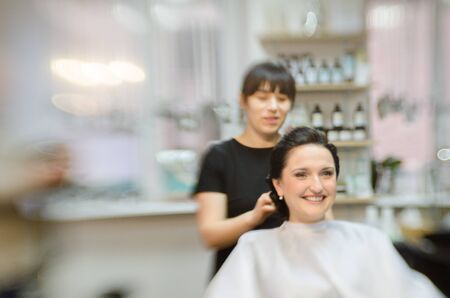 Drying hair with a hair dryer and a round brush, hairdressing procedures. new