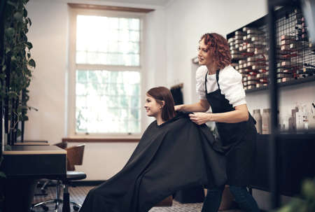 Haircut, preparation and hairdresser in salon with cover, hair removal or trim routine in small business. Grooming, start or women in studio with cape, cutting or customer styling in beauty shop.