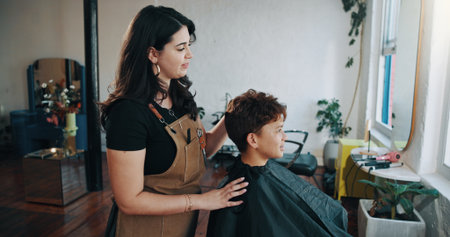 Child, service and styling with people at hairdresser for advice, appointment or treatment. Consulting, haircut or question with boy customer and hair stylist in barbershop startup for maintenance