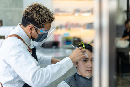 Asian professional male hairstylist combing and use scissors cutting young man customer's hair in salon. Hairdresser wearing protective face mask to prevent from coronavirus infection during pandemic.