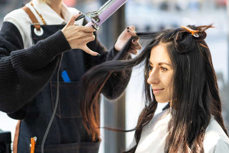 Master woman hairdresser gently curls hair curling girl in a beauty salon. Hair styling