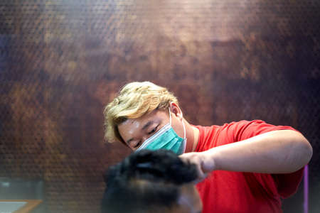 Asia Barber Shop Hair cut queueing customer's wearing face mask prevention business reopening after covonarirus lockdown, Men's hairstyling and new normal lifestyle concept.