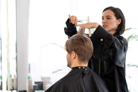 Young professional barber girl or hairstylist with scissors and hair comb in hands making haircut for a man visiting barbershop or beauty salon