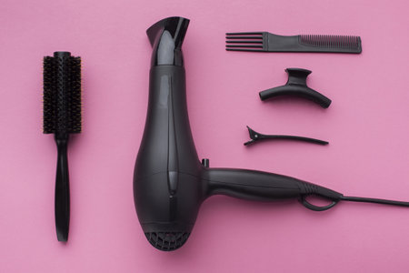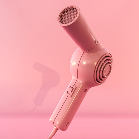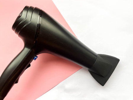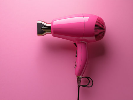 A sleek black hair dryer elegantly positioned against a vibrant pink backdrop, showcasing modern beauty trends and stylish home essentials for personal care.