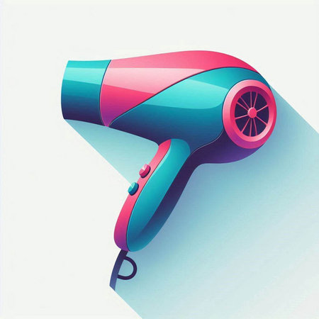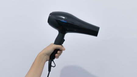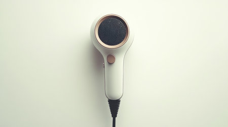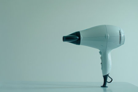 A sleek hair dryer stands against a plain backdrop, illustrating its readiness for use in personal styling and grooming activities.