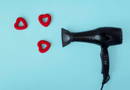 A hairdressers hair dryer and voluminous hearts on a blue background. Banner, template and greeting card for hair salon on Valentine's Day