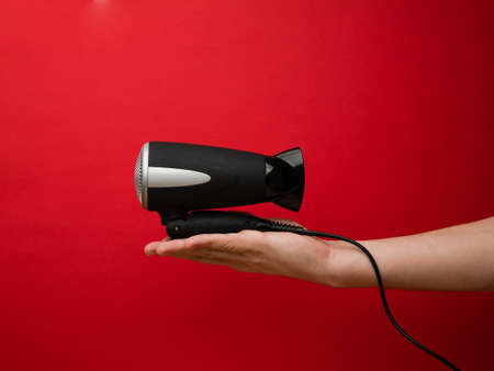 Hair care. Female hands holding hairdryer on red background. Top view