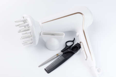 Hairdryer with different attachments, scissors, and comb on a white background.