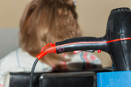 Close-up of hair dryer, concept cut salon, female stylist