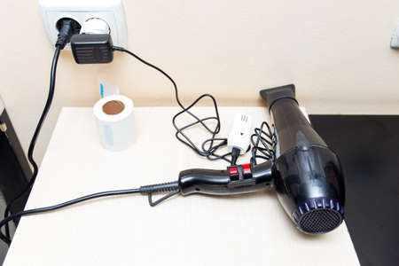 Professional hairdryer set on white woodeb table, top view.
