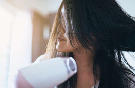 Young asian woman after bath hairbrushing her hair with comb,Female drying her long hair with dryer,Selective focus