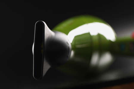 Green professional hairdryer device with nozzle on black background, tool for hair master