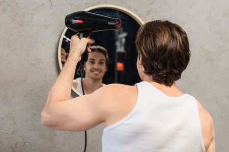 happy young man drying hair while looking in mirror in bathroom