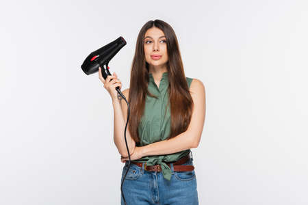young woman with shiny hair holding hair dryer isolated on gray