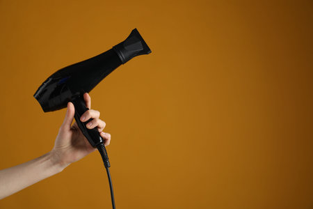 Woman with hair dryer on orange background, closeup. Space for text