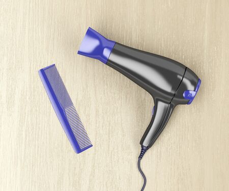 Black hair dryer and purple comb on wood table, top view
