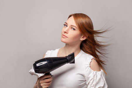 Redhead woman with blow drying hair holding hair dryer on gray wall studio background