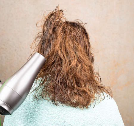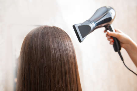 Drying women's hair with a hand dryer. Hair care. Close up.