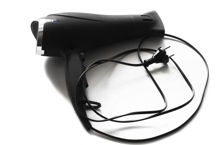 black hair dryer with connection wire on white background.