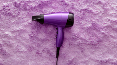 A modern purple hair dryer rests on a soft, fluffy purple background, emphasizing beauty and style. Perfect for cosmetic and hair care themes.
