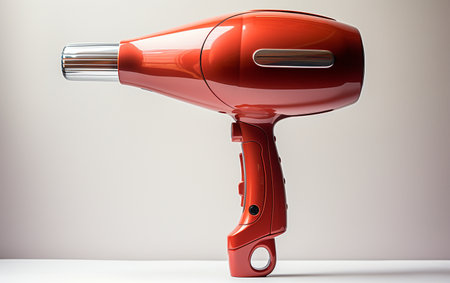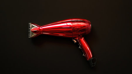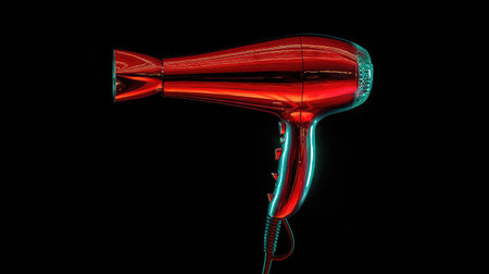 A vibrant red hair dryer showcased against a black background, highlighting its modern design and shiny appearance. Ideal for beauty enthusiasts and professionals.