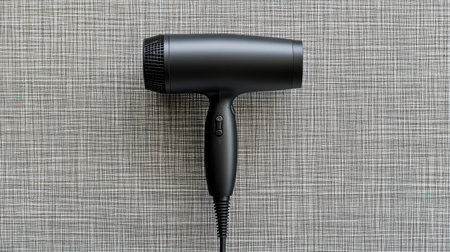 A sleek black hair dryer positioned on a textured gray surface. Ideal for beauty and wellness projects. This versatile hair styling tool offers powerful performance for salon-like results at home.
