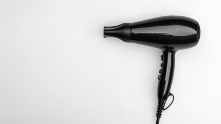 A sleek black hair dryer positioned on a clean white background, showcasing its modern design. Ideal for beauty, personal care, and home appliance use.
