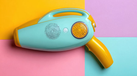 A vibrant handheld vacuum cleaner in pastel colors with a modern design, perfect for home cleaning tasks. Stylishly placed on a geometric background.