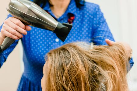 Master woman hairdresser dries the girls hair with a hairdryer and combs after washing in the beauty salon