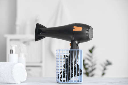 On a countertop, a hair dryer is placed next to a neatly arranged basket filled with several fluffy towels, creating a cozy and functional space for personal grooming and hygiene activities