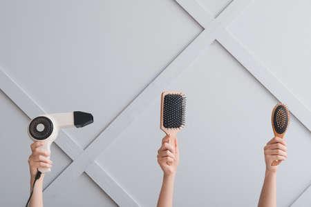 Female hands with hair tools on light background