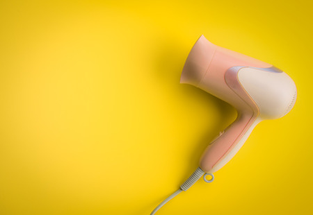 Pink hair dryer on yellow background,top view
