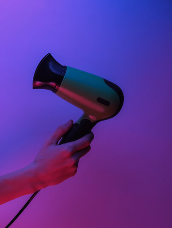 Hand holds hair dryer. Creative pop art pink blue neon color. Trendy gradient illumination. Night light