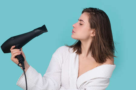 Female drying her hair with hair-drier, flying hair