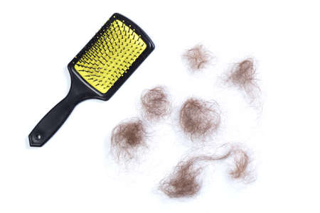 Loose hair clumps and hair brush on white background.