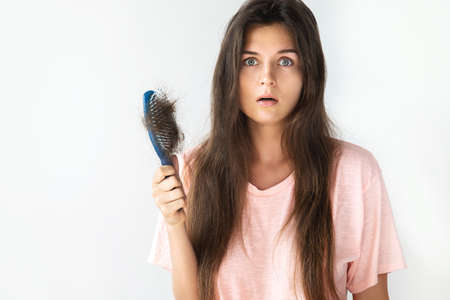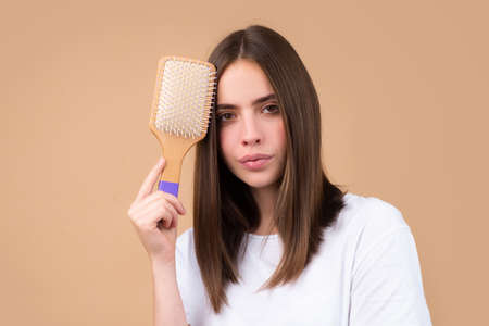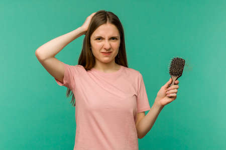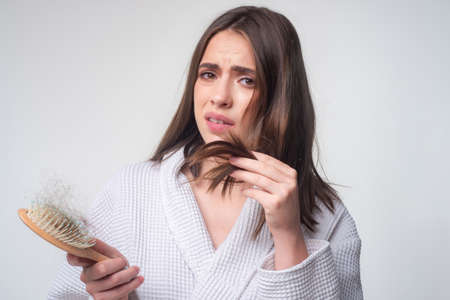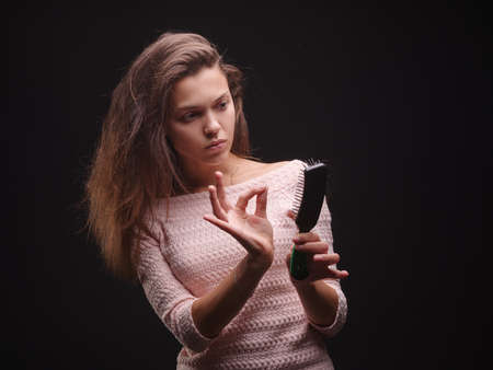 Hair loss problem treatment. Portrait of woman with a comb and problem hair.