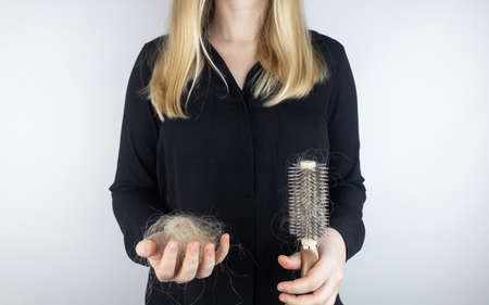 Hair loss problem. Female hand holding hairbrush with hair.