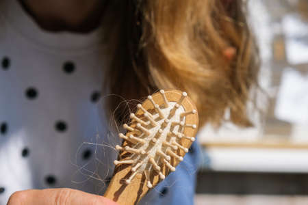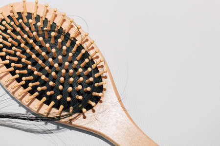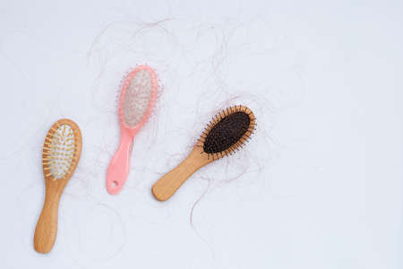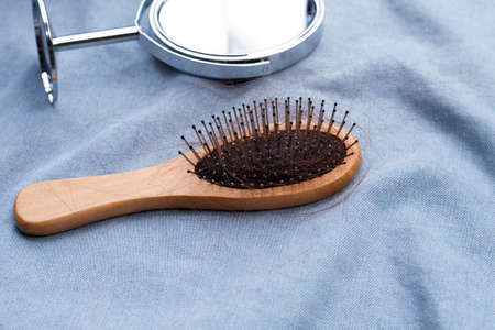 Hair loss on the comb, massage wooden brush with a clump of hair, problem of growth, hair care problems. Hair loss it cause from family history, hormonal changes, unhealthy of aging.