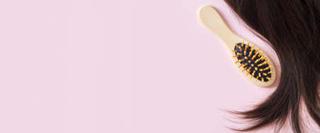 Banner of beautiful brunette female straight hair and bamboo comb brush top view