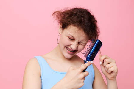 Young woman in blue t-shirts comb with hair emotions isolated background unaltered
