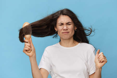 Portrait of a Caucasian young woman combing her tangled dark hair. Close up of hair brush with losing hair. blue background. The concept of baldness.