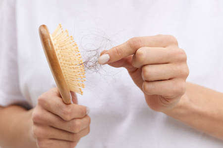 Closeup hair loss, hair fall in hairbrush, stress problem of woman with a comb.