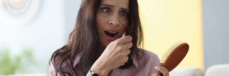 Frightened woman holds comb in her hands and looks at her hair. Split ends hair treatment concept