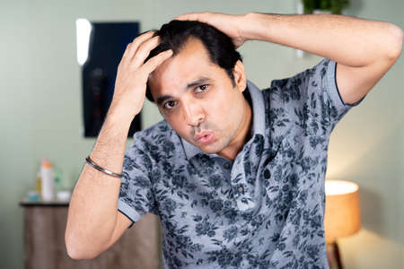 Portrait of happy smiling Young man getting gready by setting hairstyle with hands before going out - concept of morning routine and hair care.