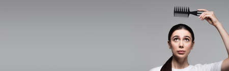 worried woman in white t-shirt holding comb above straight hair isolated on grey, banner