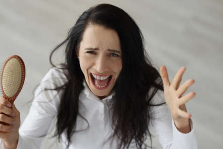 Woman with long hair screaming and holding comb in her hands