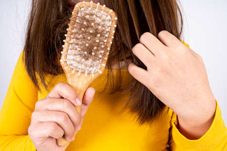 Asian woman have problem with long hair loss attach to comb brush.