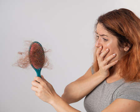 Hair loss woman with a comb and problem hair. Hairloss stressed woman and bald problems.