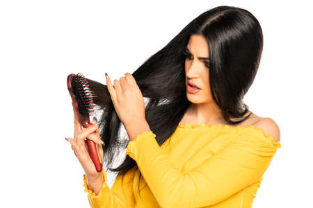a sad, upset, puzzled woman with long black hair stands in a white T-shirt on a light background and holding a wooden comb in her hand looks puzzled at her pulling aside a strand of hair