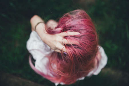 The beautiful girl with pink hair sits on the thrown ladder in an environment of a green grass